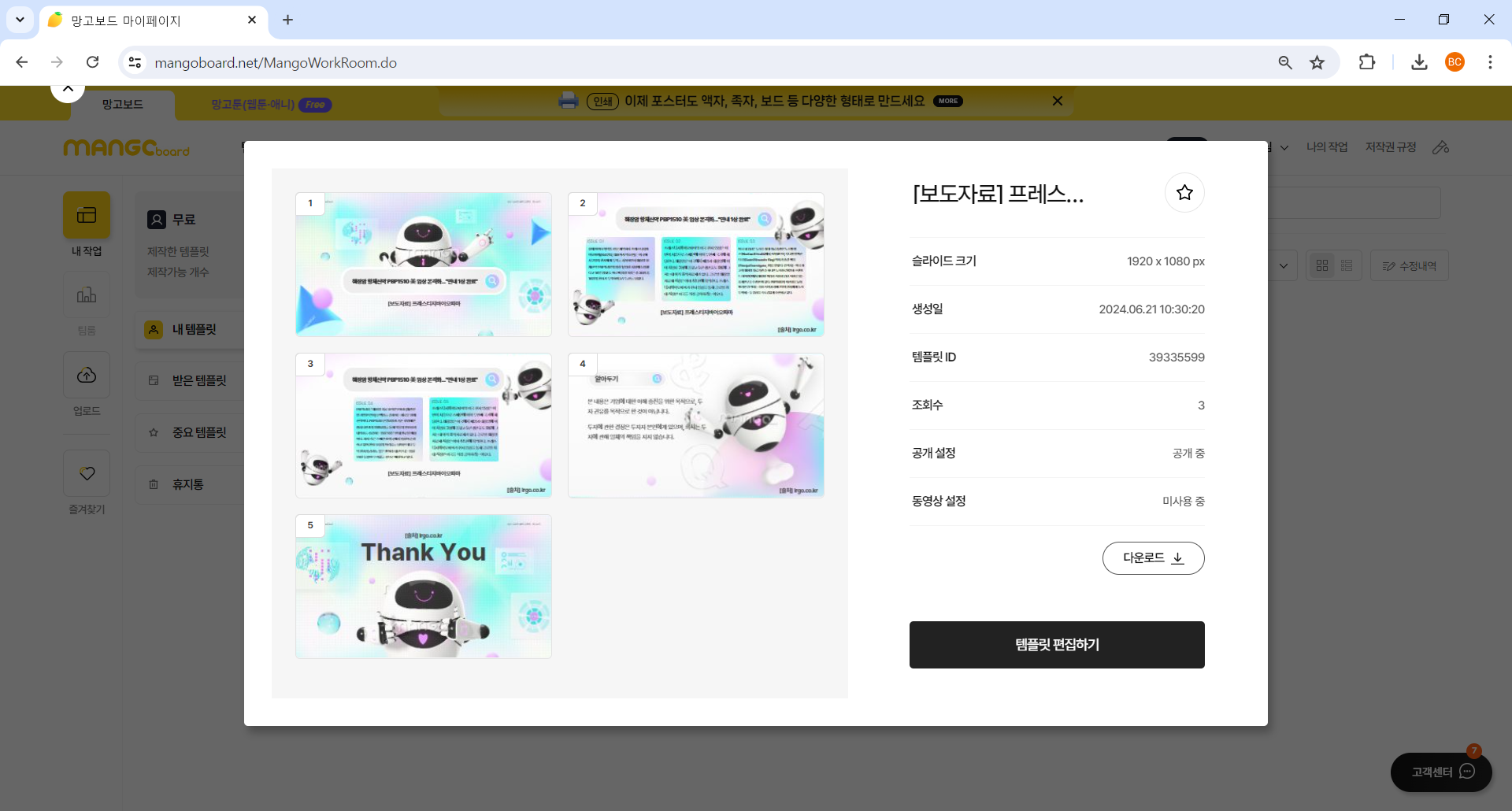 - 내 템플릿 : 작업 중인 템플릿