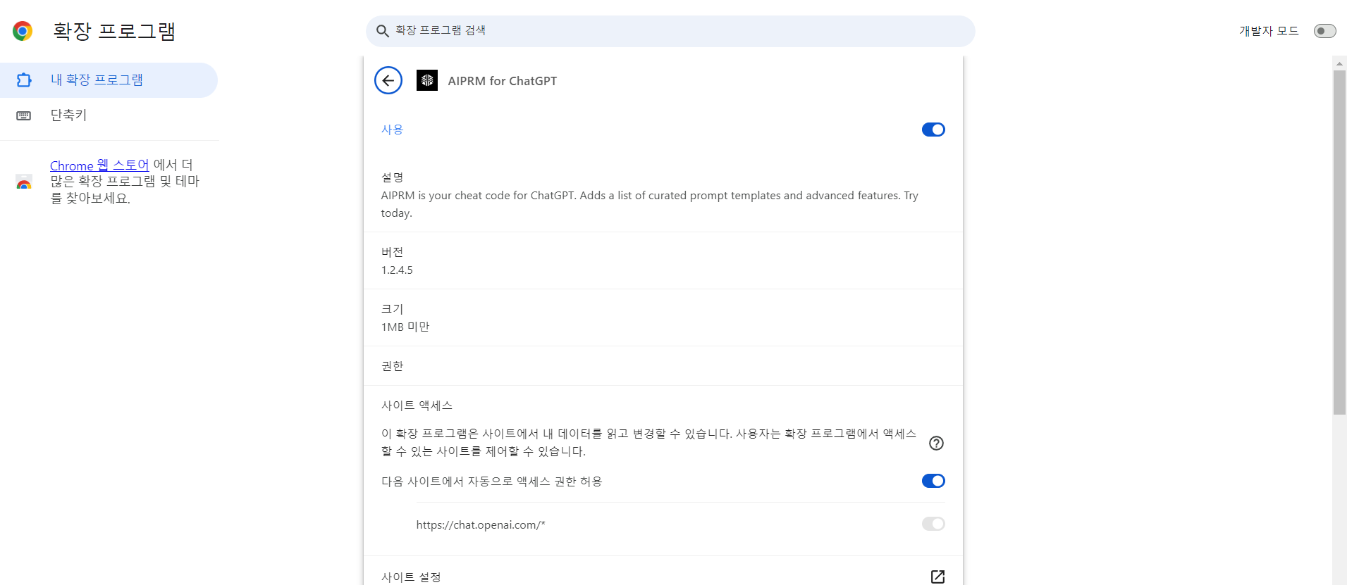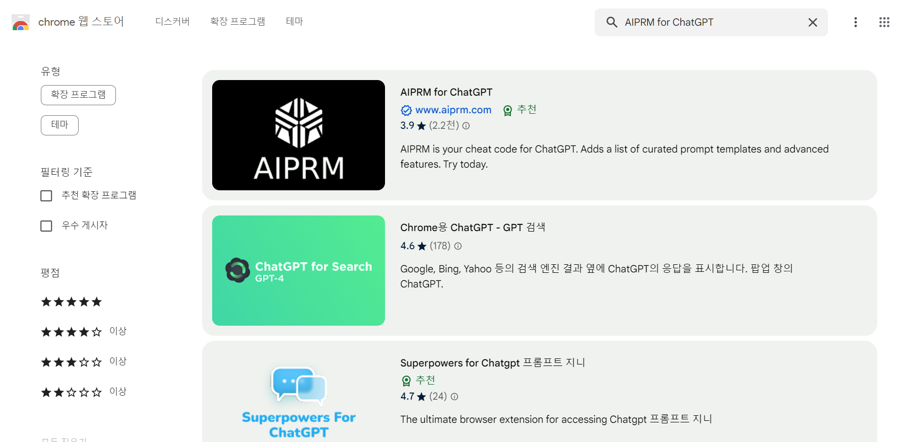- 확장 프로그램 및 테마 검색 :AIPRM for ChatGPT(검색)