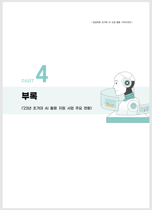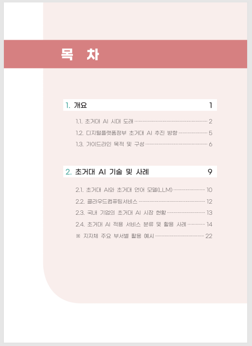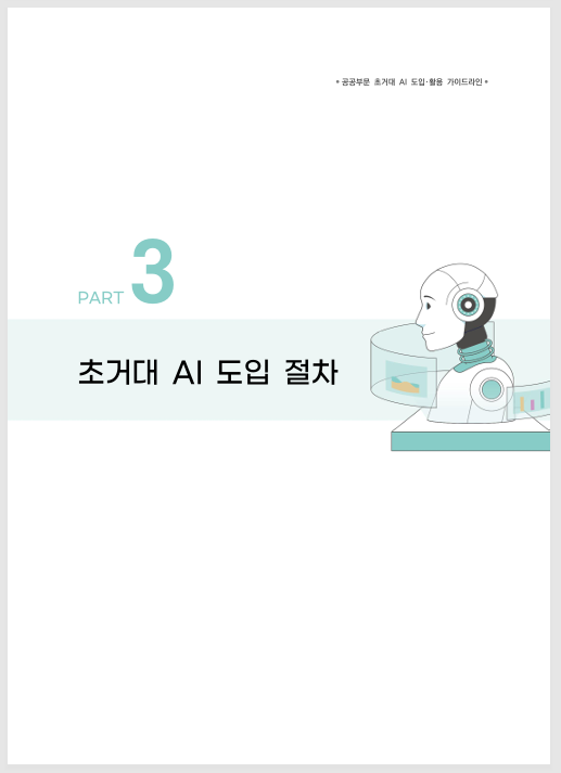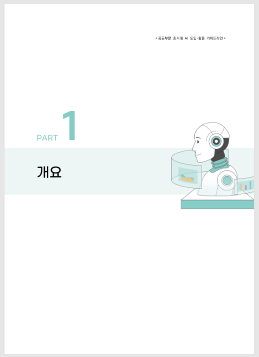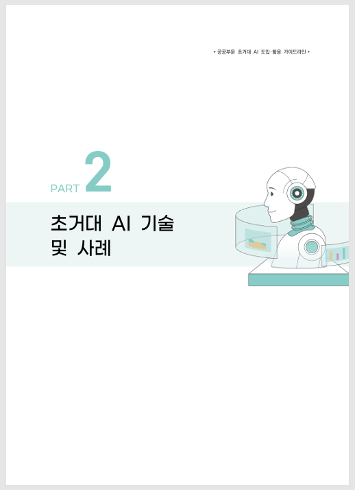 ※ 중앙부처, 지방자치단체, 공공기관이 초거대 AI를 효과적으로 도입·활용할 수 있도록, 공공부문 초거대 AI 서비스의 유형별 다양한 활용사례 등을 담은 「공공부문 초거대 AI 도입‧활용 가이드라인」입니다.