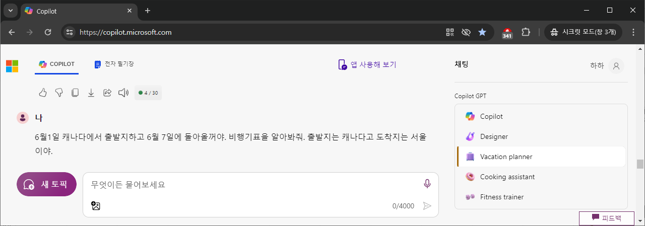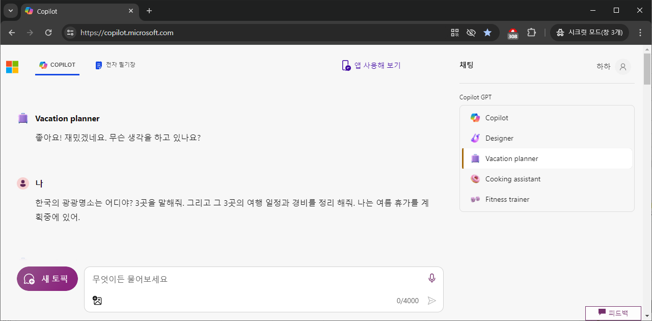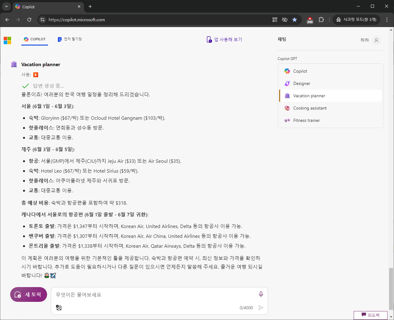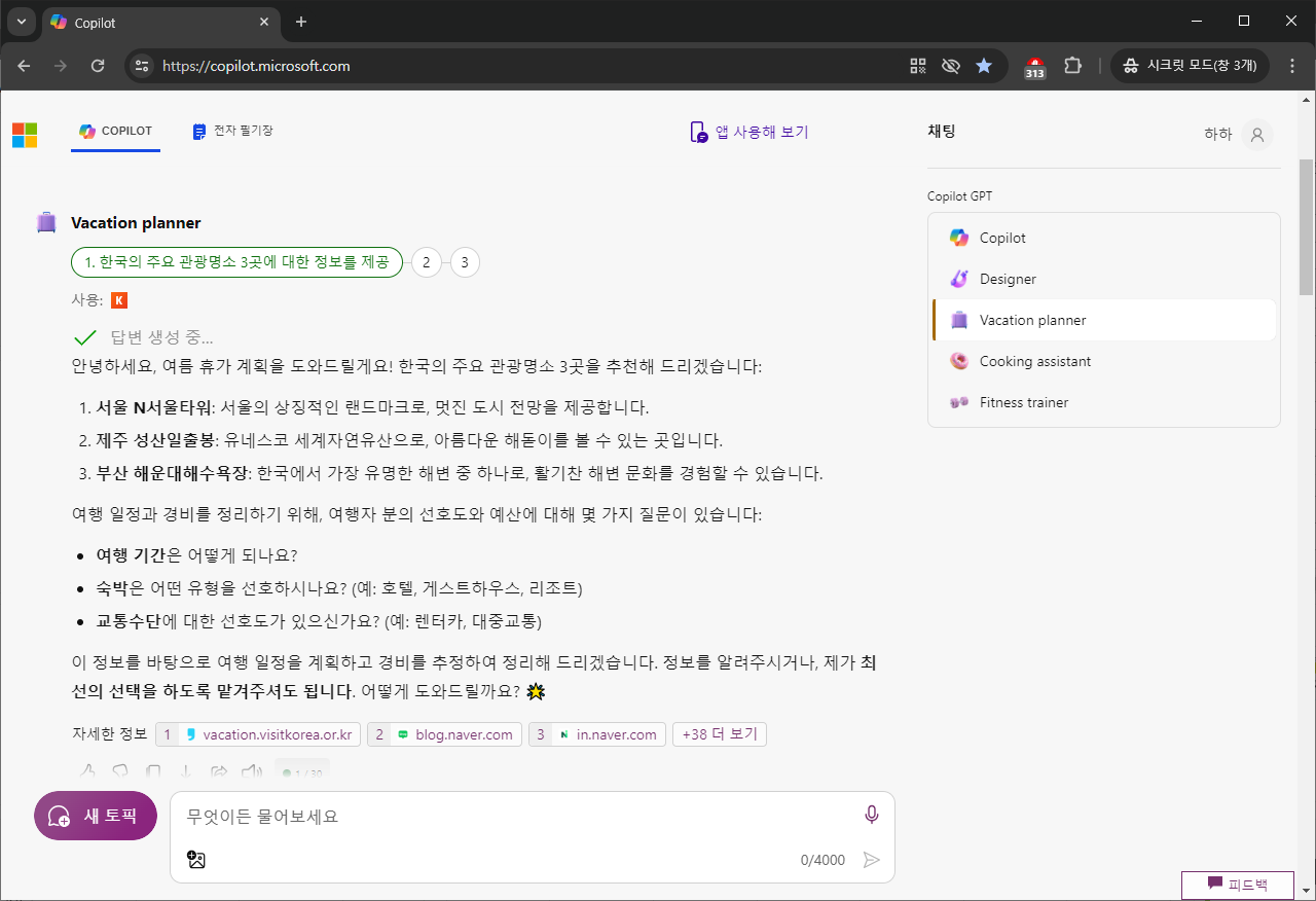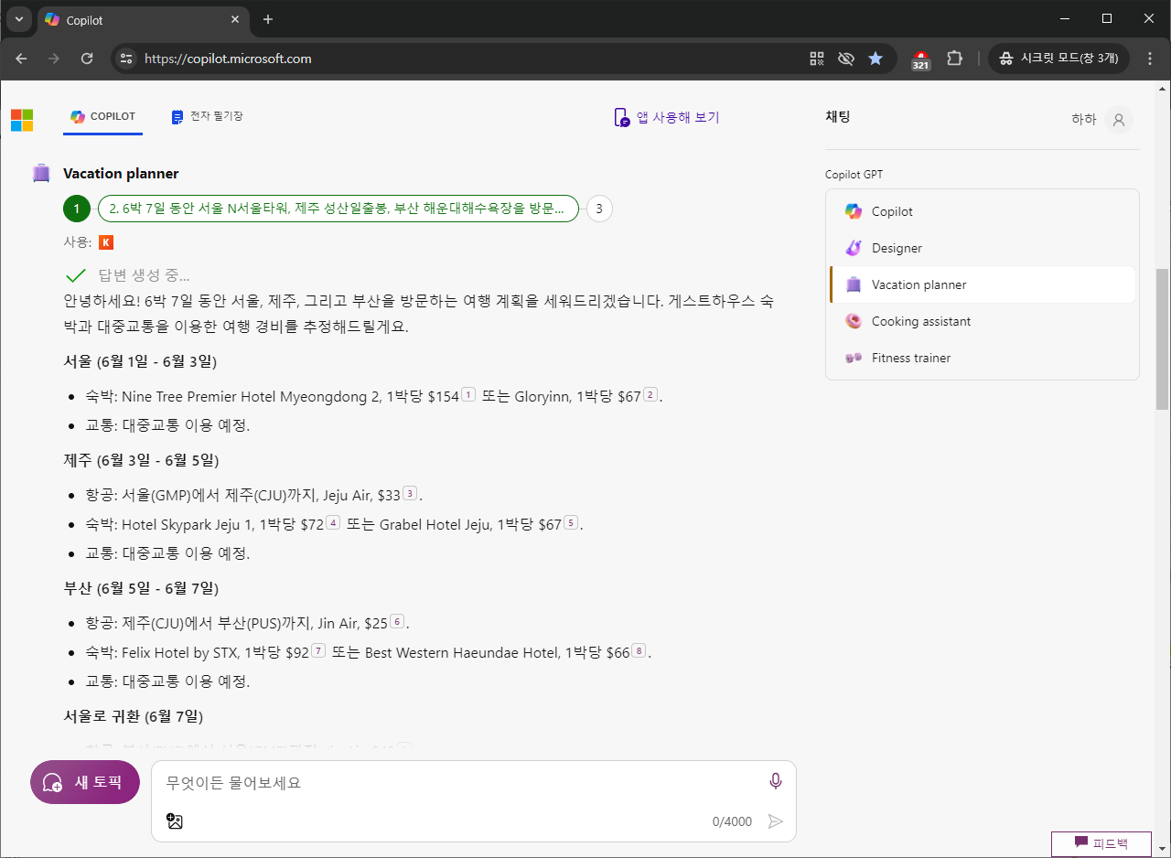 - MS Bing Copilot 을 이용하여 여행 일정 알아보기