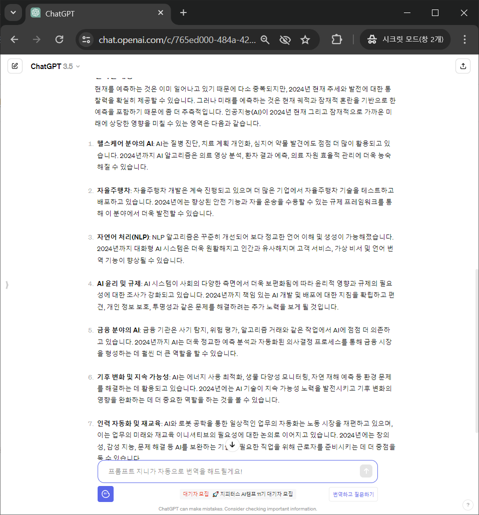 ※ 제목과 같이 "인공지능 2024년도 현재와미래 예측" 에 대해 ChatGPT3.5, ChatGPT4, 뤼튼(wrtn) 를 통해 받은 답변을 확인해 보겠습니다.