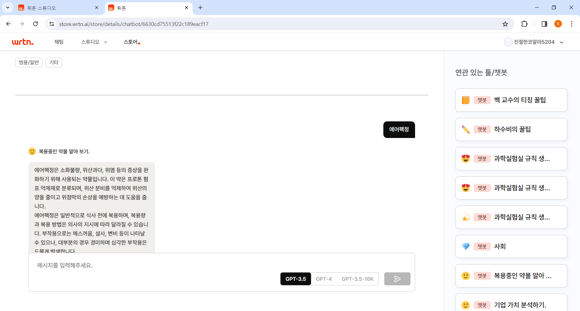 챗봇 만들기(복용중인 약물 알아 보기)-wrtn 사용