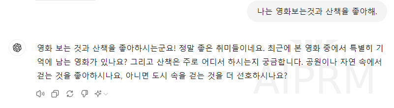- Prompt : 나는 영화보는것과 산책을 좋아해.
