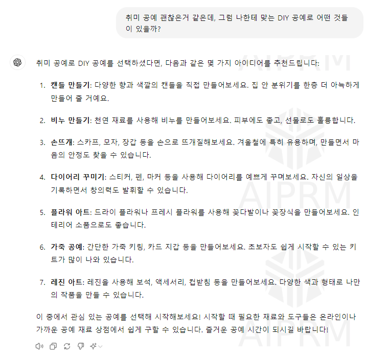 - Prompt : 취미 공예 괜찮은거 같은데, 그럼 나한테 맞는 DIY 공예로 어떤 것들이 있을까?