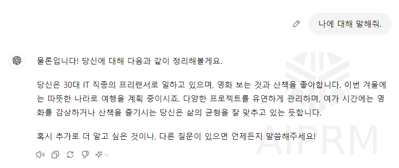 챗GPT 랑 대화 하며 나에 대한 정보를 공유 하여 나를 알아가게 하고 나에 대한 취미와 생각을 공유 할 수 있게 되는거 같습니다.