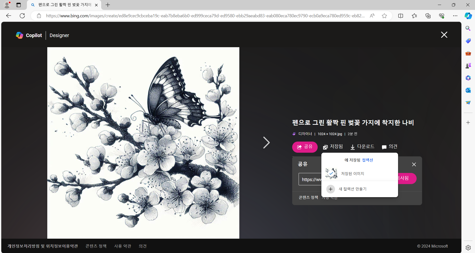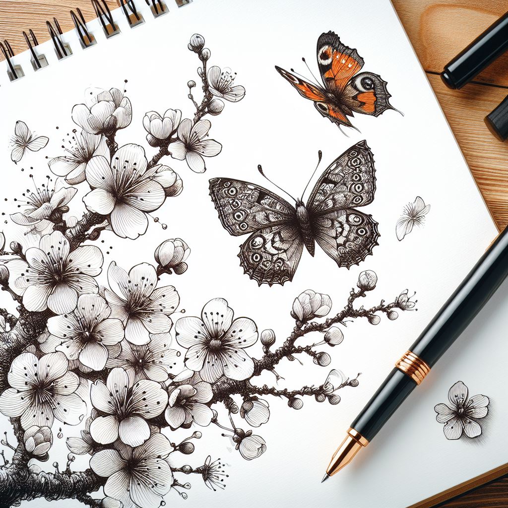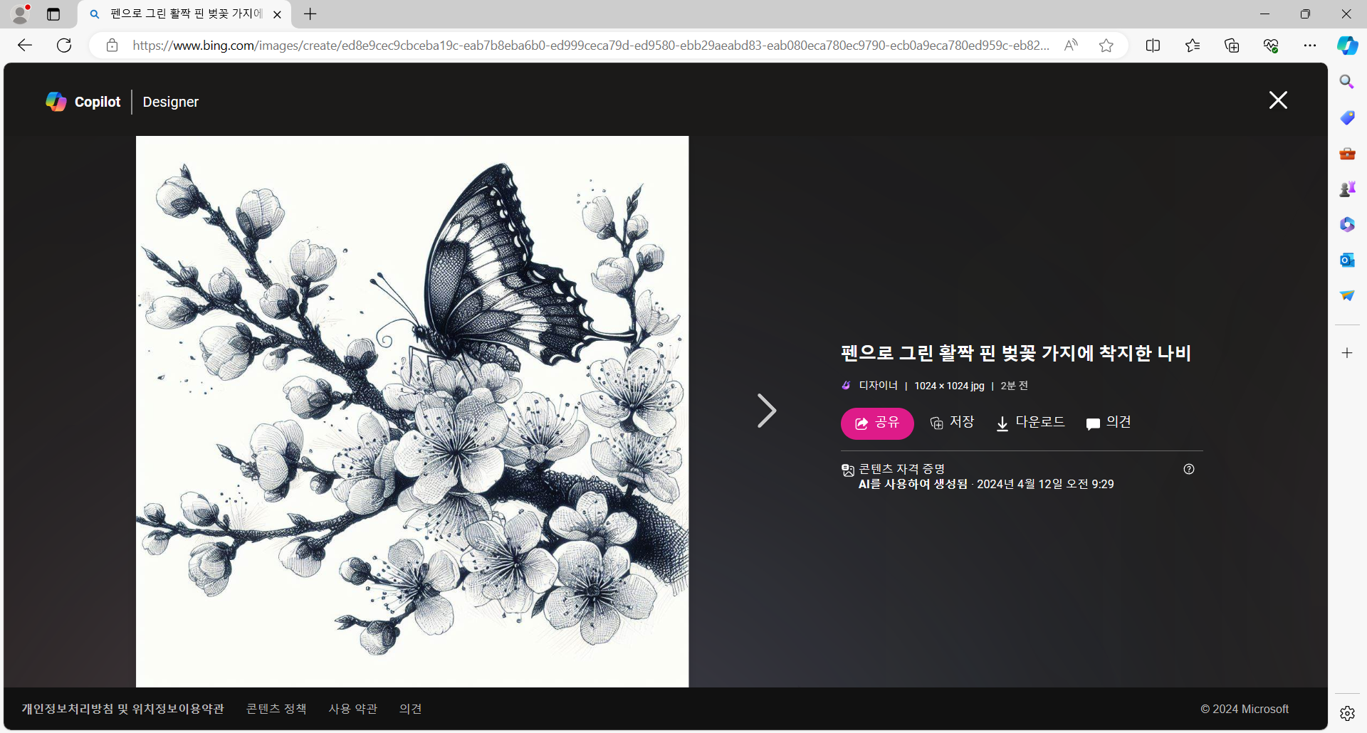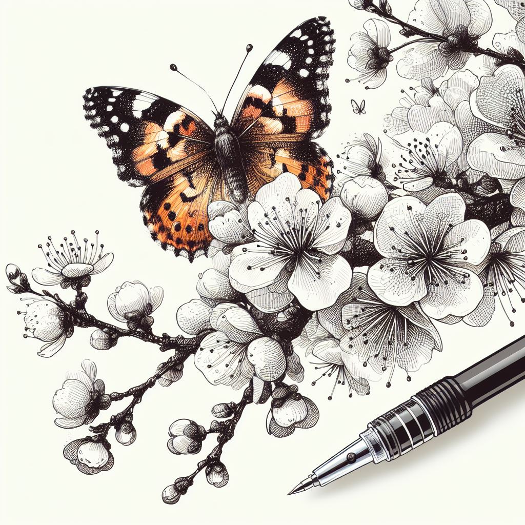 - Prompt : 펜으로 그린 활짝 핀 벚꽃 가지에 착지한 나비