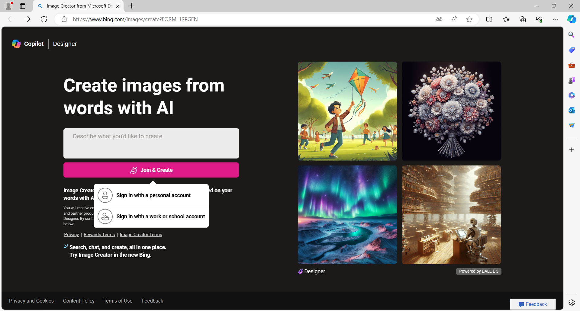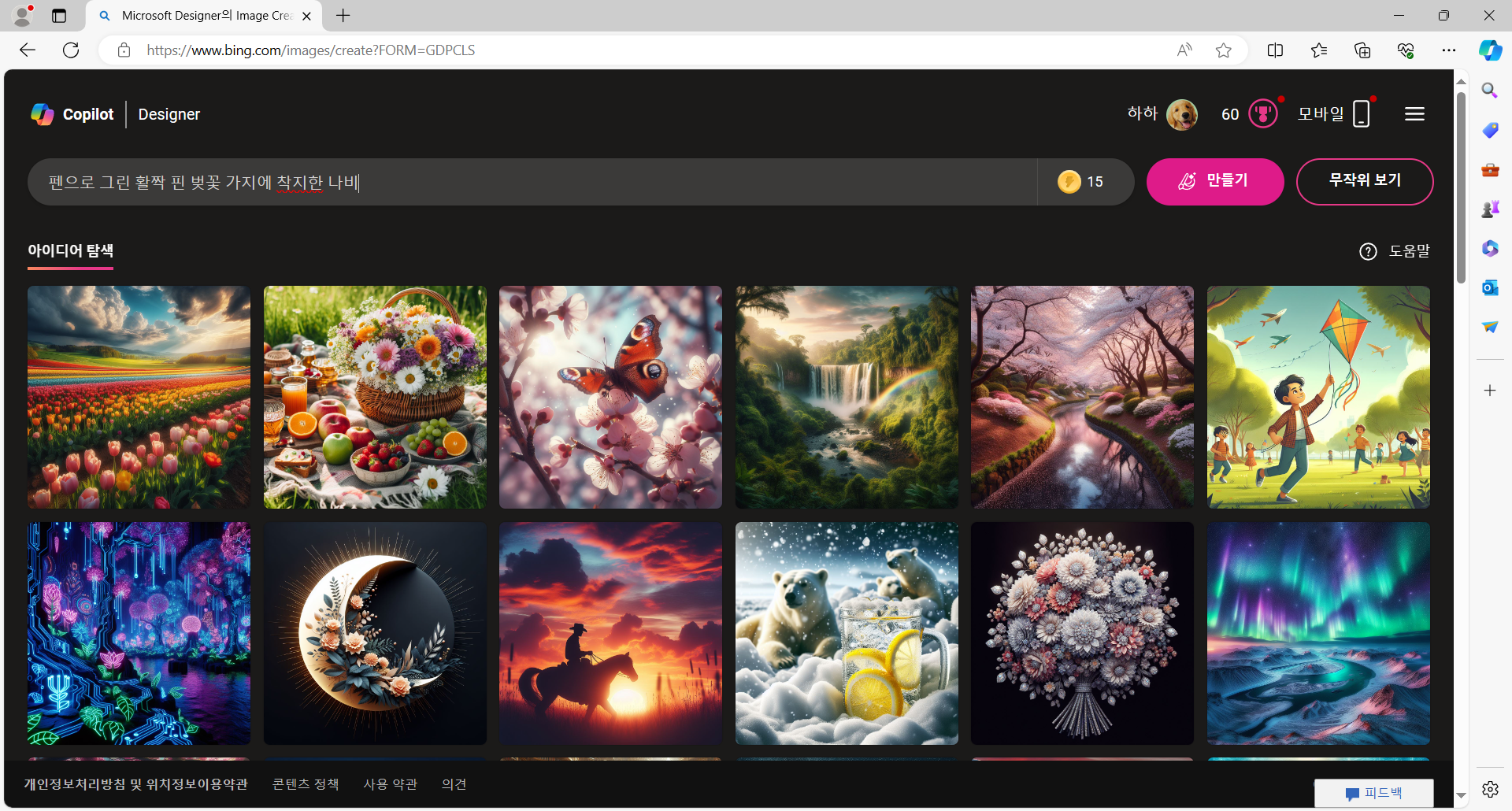 ※ 새 Microsoft 계정에 등록하거나 기존 Microsoft 계정으로 로그인합니다. 새 사용자에게는 Image Creator로 작품을 15개까지 생성하는 동안 부스트를 사용할 수 있는 혜택이 부여됩니다. 이미지는 최대 90일 동안 저장됩니다. 생각나는 아무 텍스트 설명이라도 입력하여 AI 생성 이미지들을 재미있게 생성해 보세요.