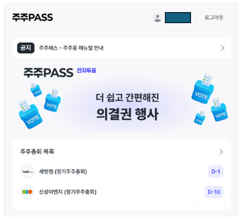- 주주투표 사이트 -> 주총 (로그인) -> 내 주식에 해당 하는 주주총회 목록 -> 의결권 행사