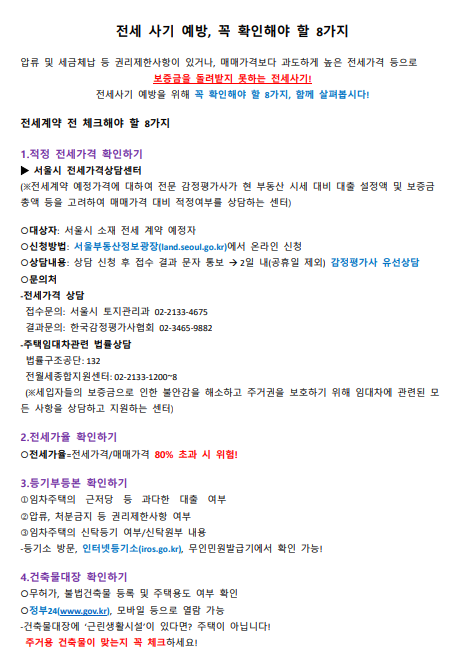 ※ Korea’s jeonse system replaces monthly rent with a large refundable deposit returned at the end of the lease. If you don’t understand how it works, you can suffer serious losses—often tied to senior liens or owners’ debt problems. Seoul provides the must-know 8 key checks in multiple languages (including English) so both locals and foreigners can avoid common pitfalls.
